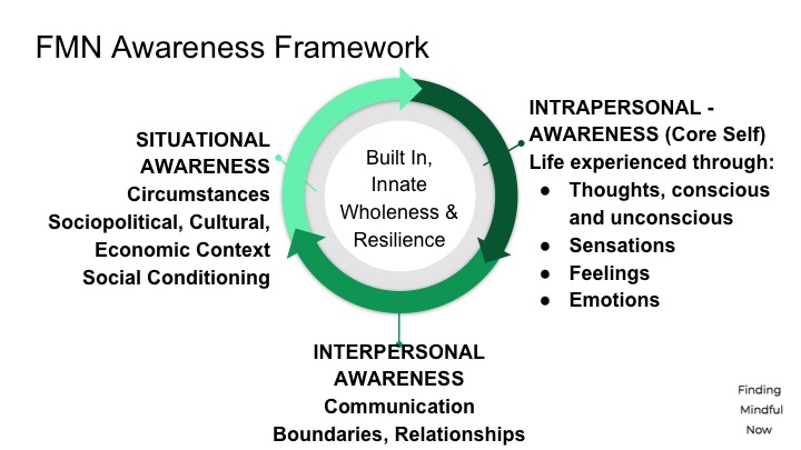 When we think it isn't safe to feel we run from experiences. And in doing so we make our lives very small. I know this because I used to attempt to shrink myself, and I still fall into the habit. This month's newsletter takes a pause from the 7 week Stress Supports Challenge to apply mindfulness to social change. Too many people are dying from institutional and interpersonal forms of oppression and it would be a breach of my integrity to not bring this forward. It's also part of why I started Finding Mindful Now. Because changing programs and policies doesn't change society if people don't change with them. Both are part of the picture; you can see a diagram of my awareness framework at the bottom of this newsletter.